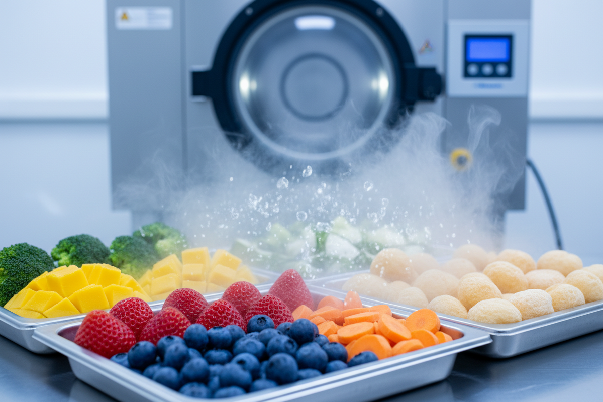 Freeze drying is a preservation method that removes moisture from fresh fruits and vegetables while maintaining their nutritional integrity. The process involves freezing produce at extremely low temperatures, then using a vacuum chamber to extract ice crystals directly, leaving behind lightweight, shelf-stable products that retain up to 97% of their original nutrients.